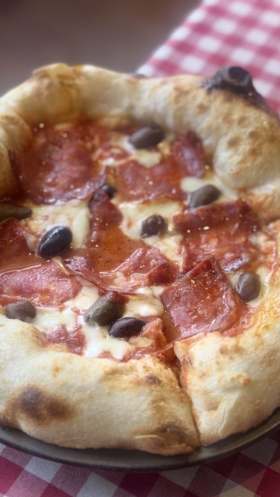 Nuestra velada en Bisnonna Aravaca comenzó con una sensacional burrata affumicata que preparan al carbón y que acompañan con calabacín al estilo napolitano, con menta, aceite EVO, ajo y ralladura de limón. Un original entrante que resulta ideal para compartir y que nos condujo a una riquísima pizza diávola que preparan con base margherita, salami picante de Nápoles y aceitunas negras. Una elaboración impecable y muy sabrosa que merece la pena acompañar con un toque de su aceite picante.